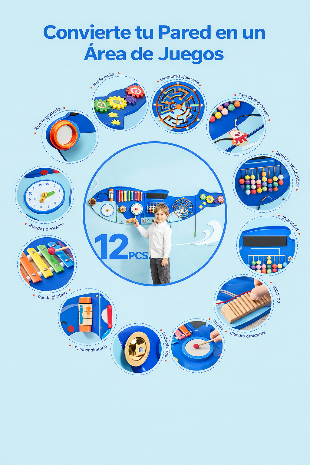 🐋 Panel de pared sensorial: Gran panel educativo con diseño de ballena y múltiples actividades.